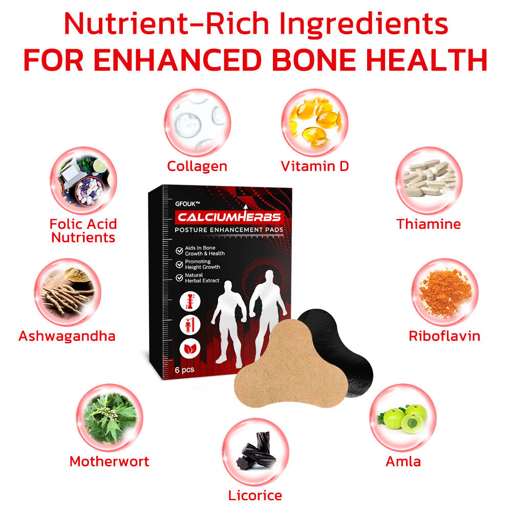 Incorporating a diverse mix of vital nutrients such as Collagen, Vitamin D, Thiamine, Riboflavin, Amla, Licorice, Motherwort, Ashwagandha, and Folic Acid, the GFOUK™ CalciumHerbs Posture Enhancement Pads feature a scientifically composed blend. This thoughtfully crafted combination works synergistically to support both bone health and height enhancement, fortifying bones, facilitating calcium absorption, enhancing energy metabolism, and delivering various health advantages. With this potent amalgamation, the patches present an efficacious formula to assist individuals in reaching their height aspirations and maintaining overall skeletal well-being.