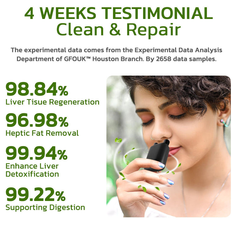 The GFOUK™ Vegan Liver Cleansing Nasal Herbal Box uses a molecular atomizer to precipitate the components. These substances operate on the liver to enhance liver detoxification and liver tissue regeneration after being inhaled into the lungs through the nasal cavity and absorbed into the bloodstream through capillaries. This approach is 63% more effective in detoxifying and regenerating the liver than medication when compared to standard liver-clearing treatments.