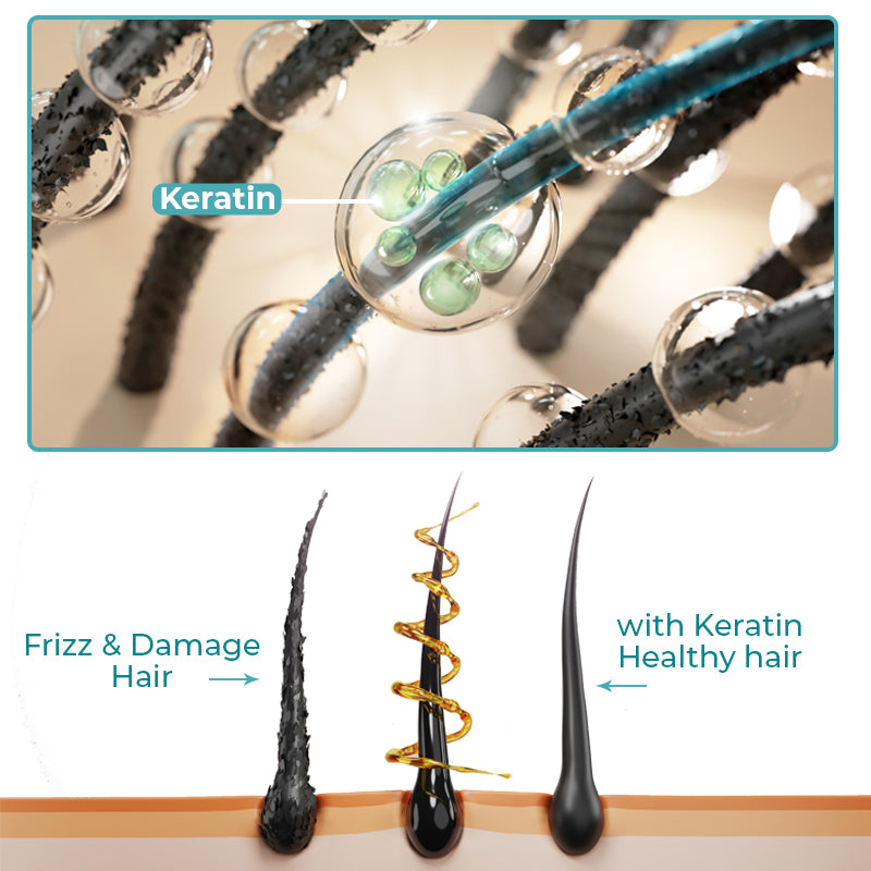 Keratin is a protein that is important for the strength, resilience, and overall health of the hair. Keratin is designed to replace and build the protein in the hair, strengthening it and improving its look. It protects the hair's inner layers against environmental influences such as UV radiation, pollution, heat, and chemicals, which can cause damage and weaken the hair structure.