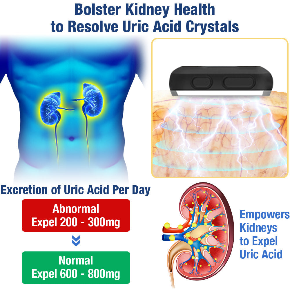 The UricEase Microcurrent Therapy Device harnesses the power of EMS therapy to enhance circulation, thereby alleviating the discomfort associated with inflammatory arthritis, particularly gout. By improving circulation, the device facilitates the removal of metabolic waste products, including uric acid crystals, from the affected joints. By promoting the transport of these waste products to the kidneys for filtration, it ensures the efficient removal of uric acid from the bloodstream, this process not only addresses the root cause of gout but also helps relieve the symptoms of inflammatory arthritis.